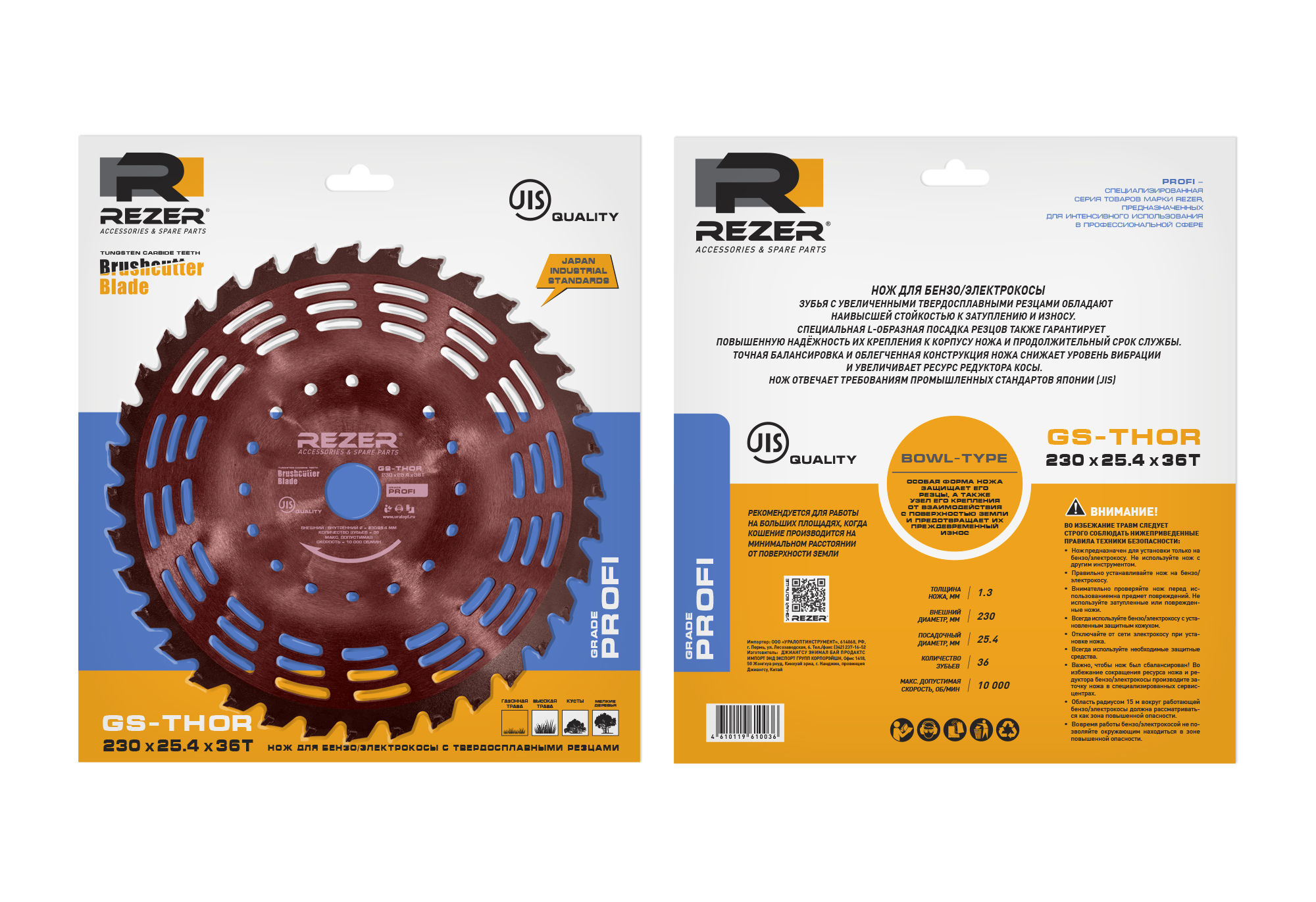 Ножи для бензо/электрокосы серии Rezer PROFI GS-Thor имеют зубья с увеличенными твердосплавными резцами, обладают наивысшей стойкостью к затуплению и износу. Специальная U-образная посадка резцов гарантирует надёжность их крепления к корпусу ножа и продолжительный срок службы. Точная балансировка и облегченная конструкция ножа снижает уровень вибрации и увеличивает ресурс редуктора косы.