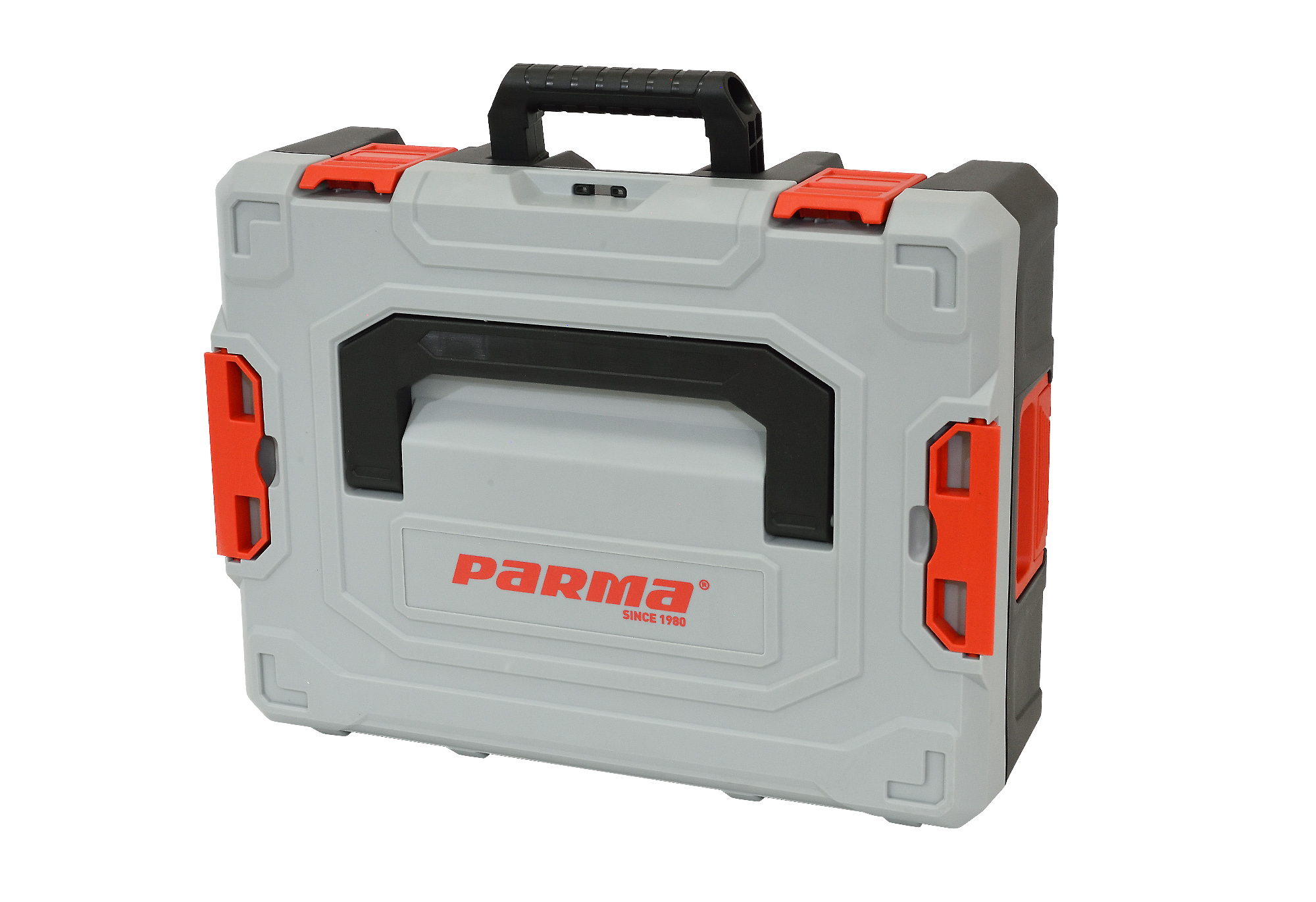 Модульные кейсы для дисковых пил по габаритам чуть больше, чем универсальные кейсы остальных инструментов линейки Parma Electron. Они снабжены пластиковыми замками и двумя ручками для переноски – сверху и сбоку. Отдельные кейсы можно соединить друг с другом в удобные для хранения и переноски «столбики» (система Click’n’Go – «защёлкни и иди»). Как раз для переноски их в таком виде и используются большие откидывающиеся ручки на их боковинах.