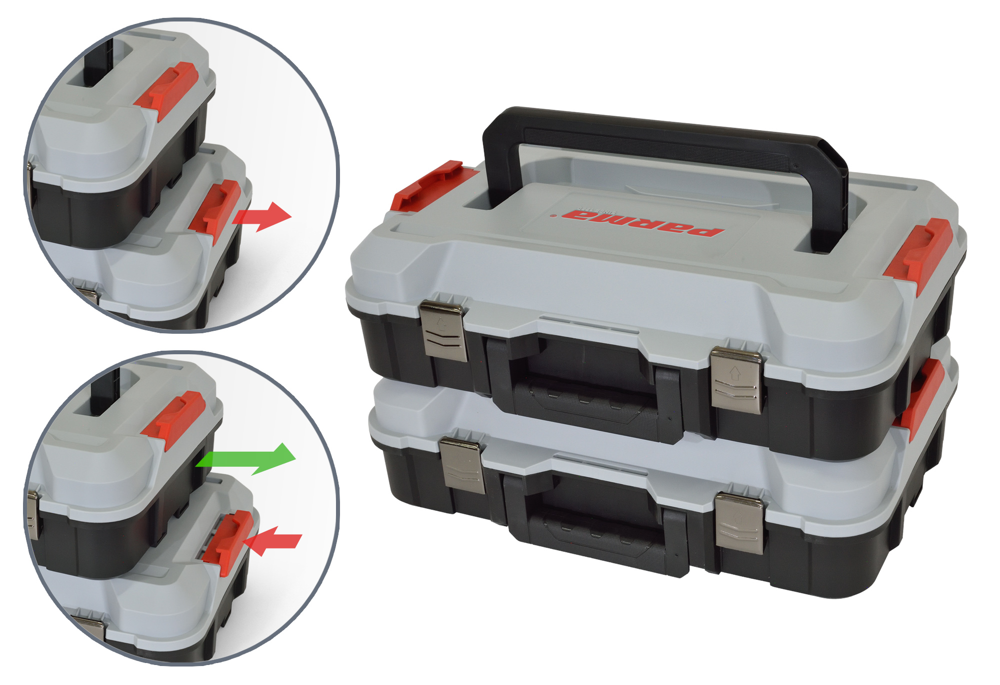 Модульные кейсы, снабжены металлическими замками и двумя ручками для переноски – сверху и сбоку. Отдельные кейсы можно соединить друг с другом в удобные для хранения и переноски «столбики» (система Click’n’Go – «защёлкни и иди»). Как раз для переноски их в таком виде и используются большие откидывающиеся ручки на их боковинах.