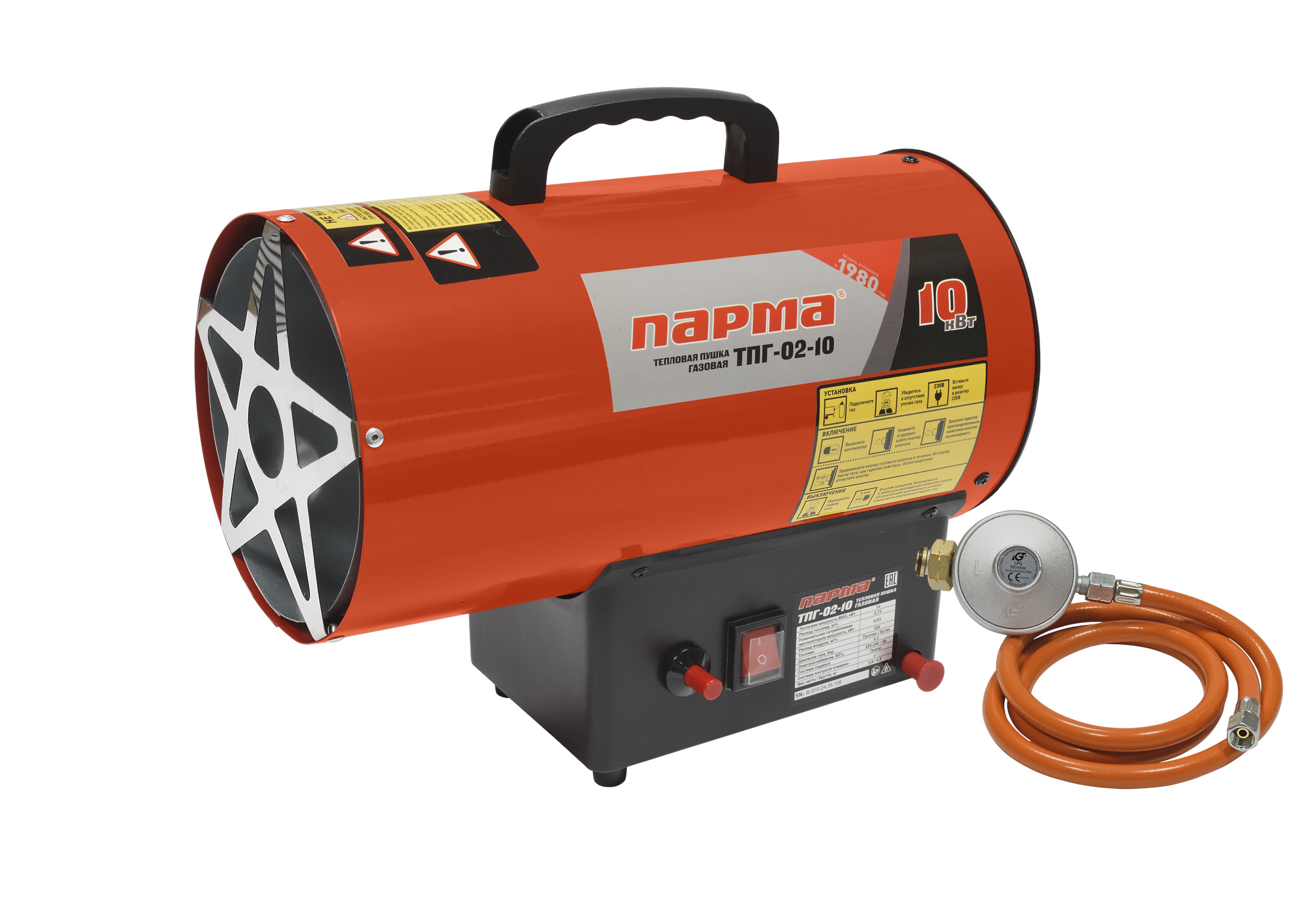 Газовая пушка Парма ТПГ-02-10 – воздухонагреватель прямого нагрева, работающий на газовом топливе. Топливо необходимо для получения горячей атмосферы в камере сгорания, а электроэнергия, подводимая к устройству, необходима для питания вентилятора, нагнетающего воздух, и для функционирования автоматики. Газовая пушка является простой и надежной конструкцией без дымохода, но горячий воздух и продукты сгорания из устройства поступают в помещение.