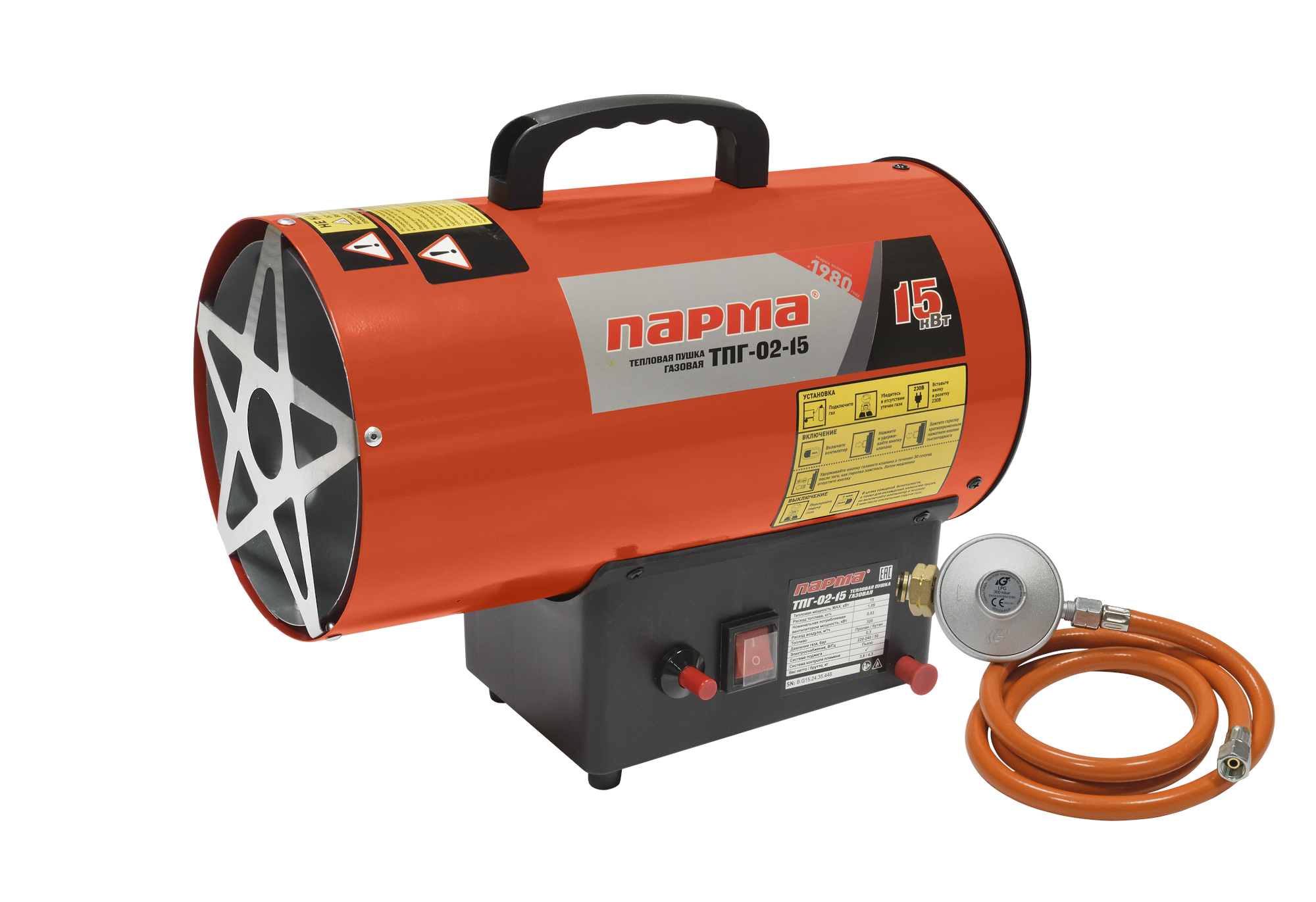 Газовая пушка Парма ТПГ-02-15 – воздухонагреватель прямого нагрева, работающий на газовом топливе. Топливо необходимо для получения горячей атмосферы в камере сгорания, а электроэнергия, подводимая к устройству, необходима для питания вентилятора, нагнетающего воздух, и для функционирования автоматики. Газовая пушка является простой и надежной конструкцией без дымохода, но горячий воздух и продукты сгорания из устройства поступают в помещение.