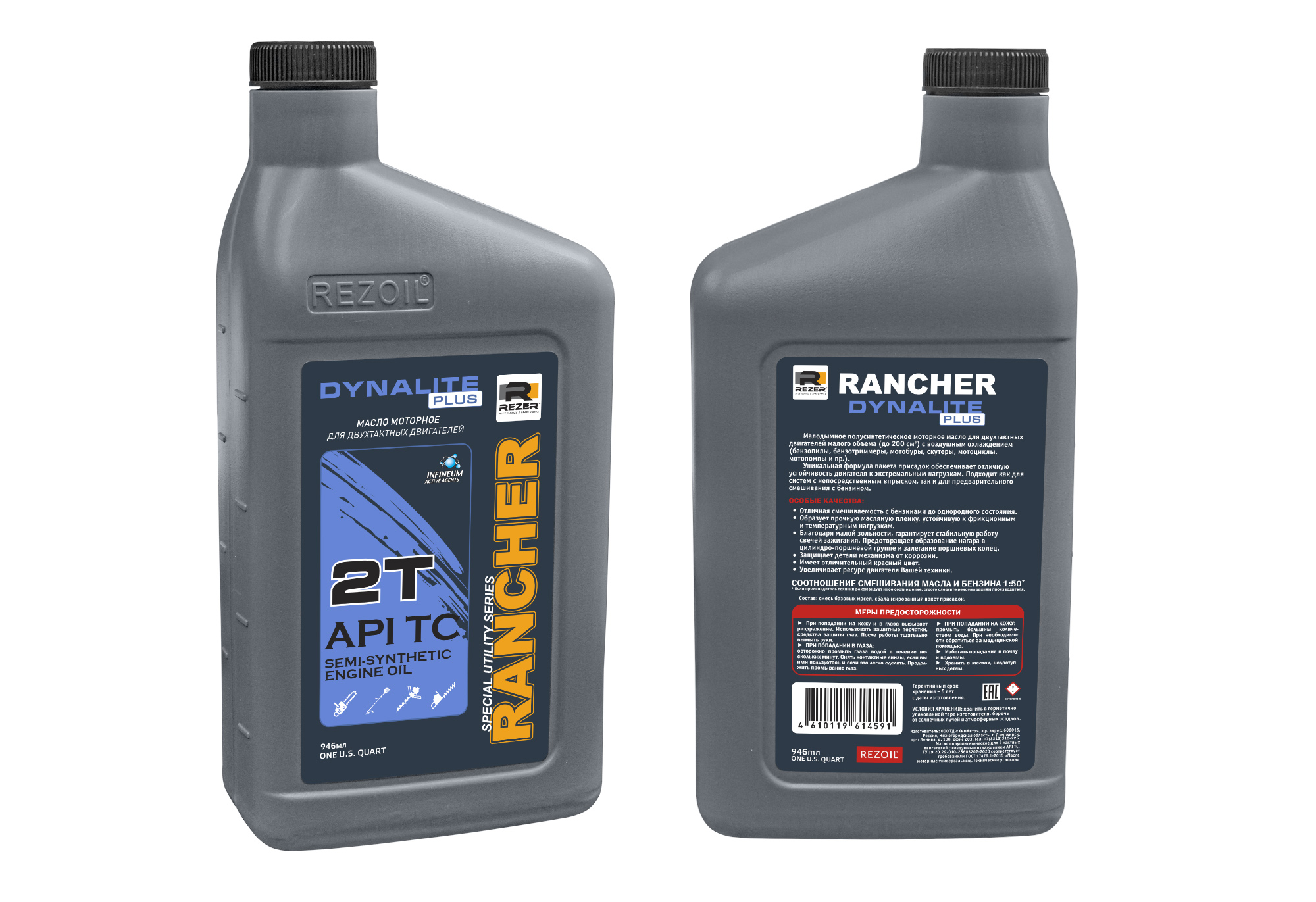 Малодымное полусинтетическое моторное масло Rezoil Rancher DYNALITE PLUS 2T для двухтактных двигателей малого объема (до 200 см3) с воздушным охлаждением (бензопилы, бензотриммеры, мотобуры, скутеры, мотоциклы, мотопомпы и пр.).