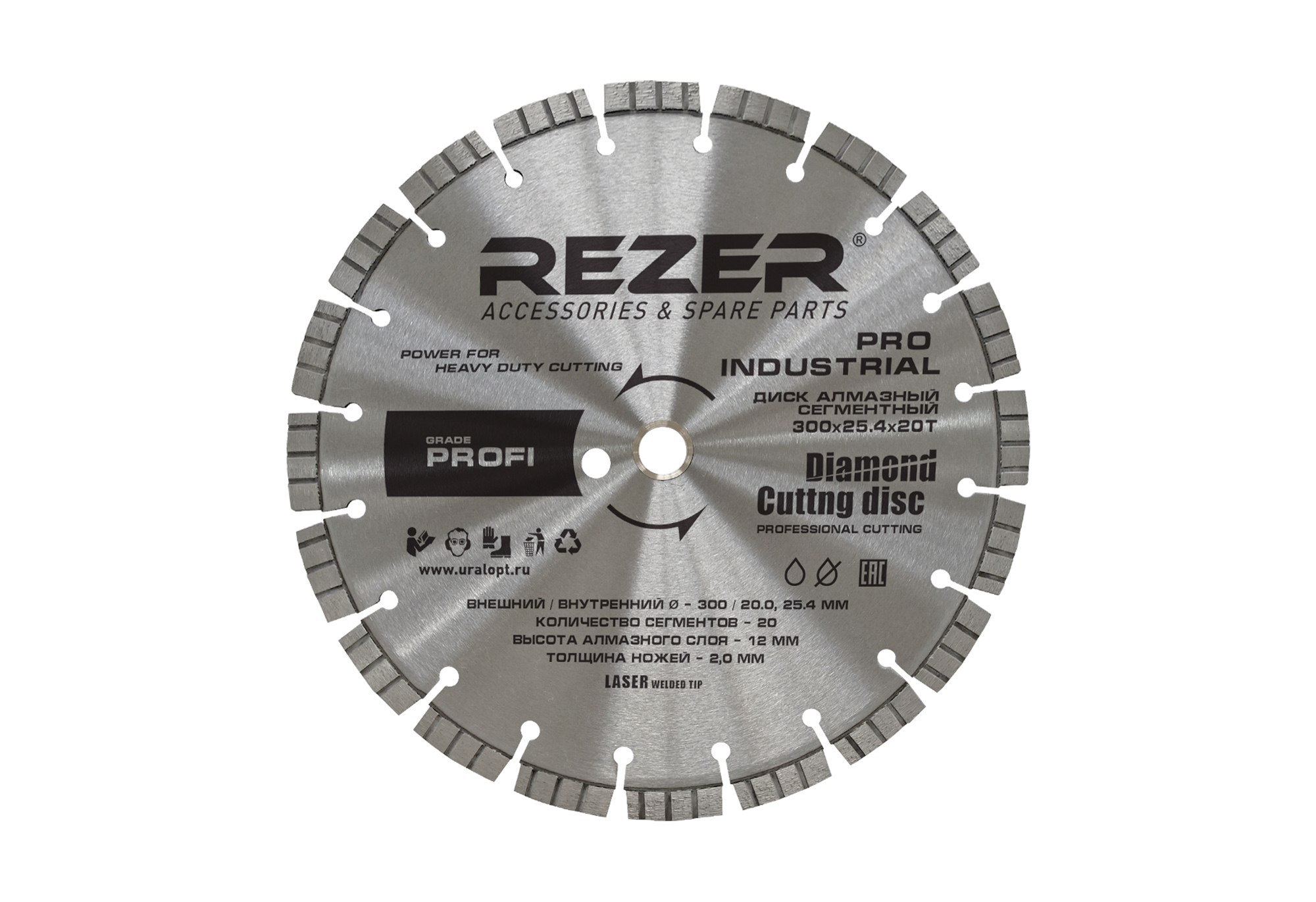 Диск алмазный Rezer PRO INDUSTRIAL 300x25.4x20T применяется для резки армирован­ного бетона с большим содержанием арматуры или гравия, пенобетона, кирпича, гранита, асфальтобетона, тротуарной плитки, мрамора, песча­ника, стройматериалов, шамота.