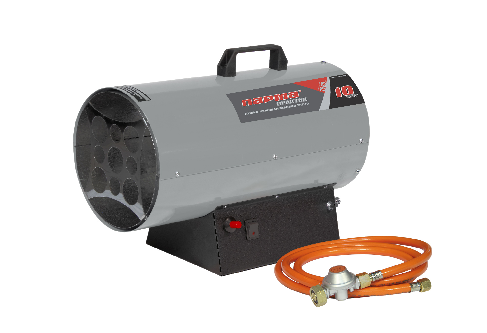 Газовая пушка Парма Практик ТПГ-10 – воздухонагреватель прямого нагрева, работающий на газовом топливе. Топливо необходимо для получения горячей атмосферы в камере сгорания, а электроэнергия, подводимая к устройству, необходима для питания вентилятора, нагнетающего воздух, и для функционирования автоматики. Газовая пушка является простой и надежной конструкцией без дымохода, но горячий воздух и продукты сгорания из устройства поступают в помещение.