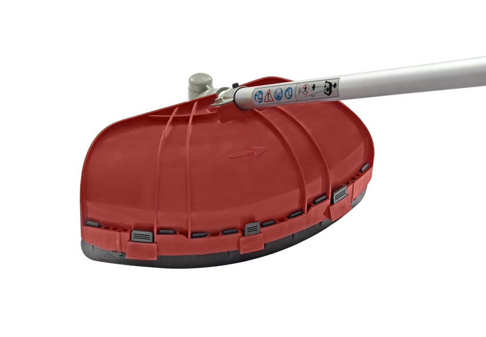 Большой пластиковый кожух надежно защищает пользователя от отходов травы и древесины, вылетающих из под режущей системы косы в процессе работы.